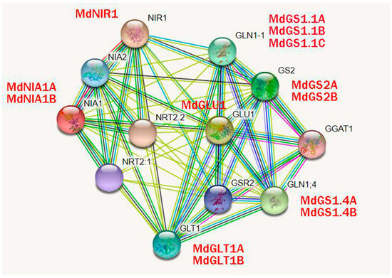 In order to predict the potential biological function of apple nitrogen assimilation enzymes, a protein interaction relationship network of key enzymes of nitrogen assimilation in apples was constructed based on the homologous sequences in the model species Arabidopsis. In Figure 2, the results show that there is a very close relationship between the proteins of the key enzymes of nitrogen assimilation, and they all have a possible interaction with NRT2.1 and NRT2.2.
