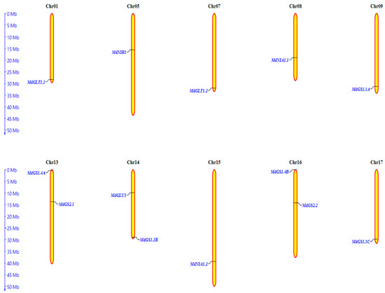 The location information of apple nitrogen key enzyme genes was extracted from the gene ID in the apple genome annotation file (Malus domestica.v1.0.consensus.gff), and submitted to the online software MG2C (http://mg2c.iask.in/mg2c_v2.0/, accessed on 31 January 2025) for chromosome mapping.