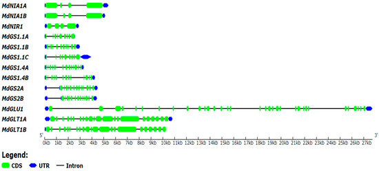 Using the Gene Structure View package of TBtools (v1.098691), the CDS, UTR, and intron configurations of apple nitrogen key enzyme genes were examined with an apple genome annotation file (Malus domestica.v1.0.consensus.gff) [34].