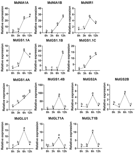 Following the treatment of apple seedlings with nitrate nitrogen for varying durations (0, 3, 6 and 12h), the expression levels of 13 genes associated with apple nitrogen assimilation enzymes were analyzed, revealing diverse patterns of change (Figure 5). The expression profiles of the MdNIA1A and MdNIA1B genes were analogous, exhibiting a marked increase in expression from 0 to 6 h, followed by a relatively stable high expression from 6 to 12 h. This suggests that nitrate nitrogen treatment significantly induced transcription in the early phase (0–6h), with expression stabilizing in the later phase. The MdNiR1 gene expression was slightly upregulated between 0 and 6 h, decreased from 6 to 12 h, and peaked at 6 h, indicating that the gene’s expression activation in response to nitrate nitrogen was primarily concentrated around 6 h post-treatment, after which expression was inhibited. The gene expression of MdGS1.1A, MdGS1.1C, and MdGS1.4A demonstrated an overall upward trend, with rapid upregulation from 0 to 6 h and sustained high levels from 6 to 12 h, suggesting that nitrate treatment facilitated their continuous expression, with approximately 6 h identified as a critical induction point. The expression profile of the MdGS1.1B gene remained notably low and stable from 0 to 6 h, followed by a marked increase from 6 to 12 h. This suggests a delayed transcriptional response to nitrate nitrogen, with significant activation occurring after 6 h. Conversely, the MdGS1.4B gene exhibited a gradual increase in expression from 0 to 6 h, peaking at 6 h, and subsequently declining sharply by 12 h. This pattern is indicative of a typical short-term high induction followed by rapid attenuation. The expression levels of MdGS2A, MdGLU1, MdGLT1A, and MdGLT1B demonstrated an initial increase, peaking around 6 h, before declining, suggesting that these genes are upregulated by nitrate nitrogen between 0 and 6 h, with a subsequent downregulation from 6 to 12 h. This indicates that their response to nitrate nitrogen is most pronounced at the midpoint of the treatment (6 h), with negative regulation occurring thereafter. The expression of the MdGS2B gene showed a slight decrease between 0 and 3 h, an upregulation to a peak between 3 and 6 h, and a decline from 6 to 12 h. This gene’s response dynamics differ from the others, with the 3 to 6 h window being critical for activation. In summary, there are significant differences in the response patterns of different nitrogen assimilation-related enzyme genes to nitrate nitrogen treatment.