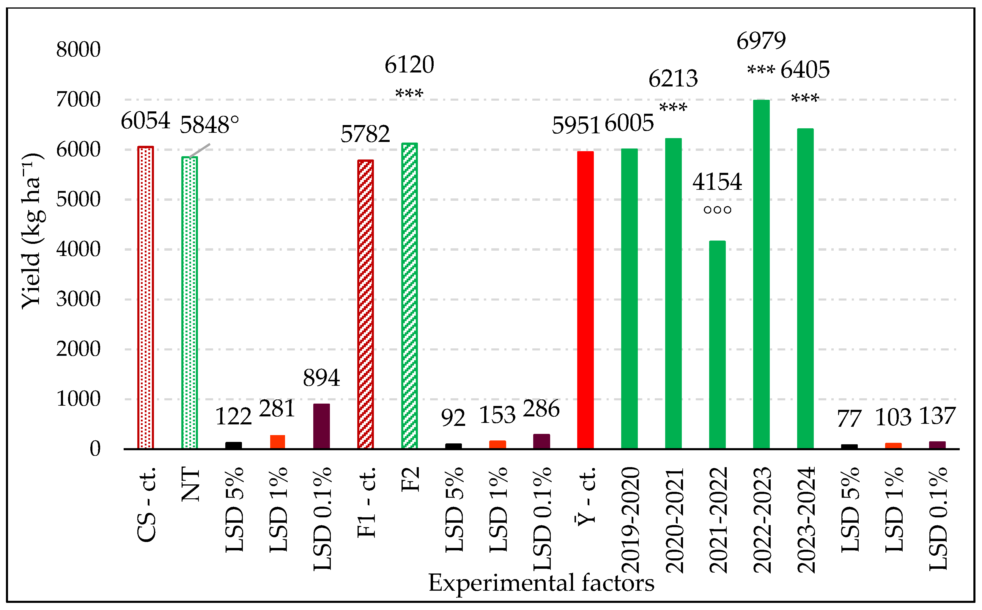 3.2. Influence of the Triple Interaction, Fertilization (F) × Year (Y) × Soil Tillage System (S), on Winter Wheat Yield