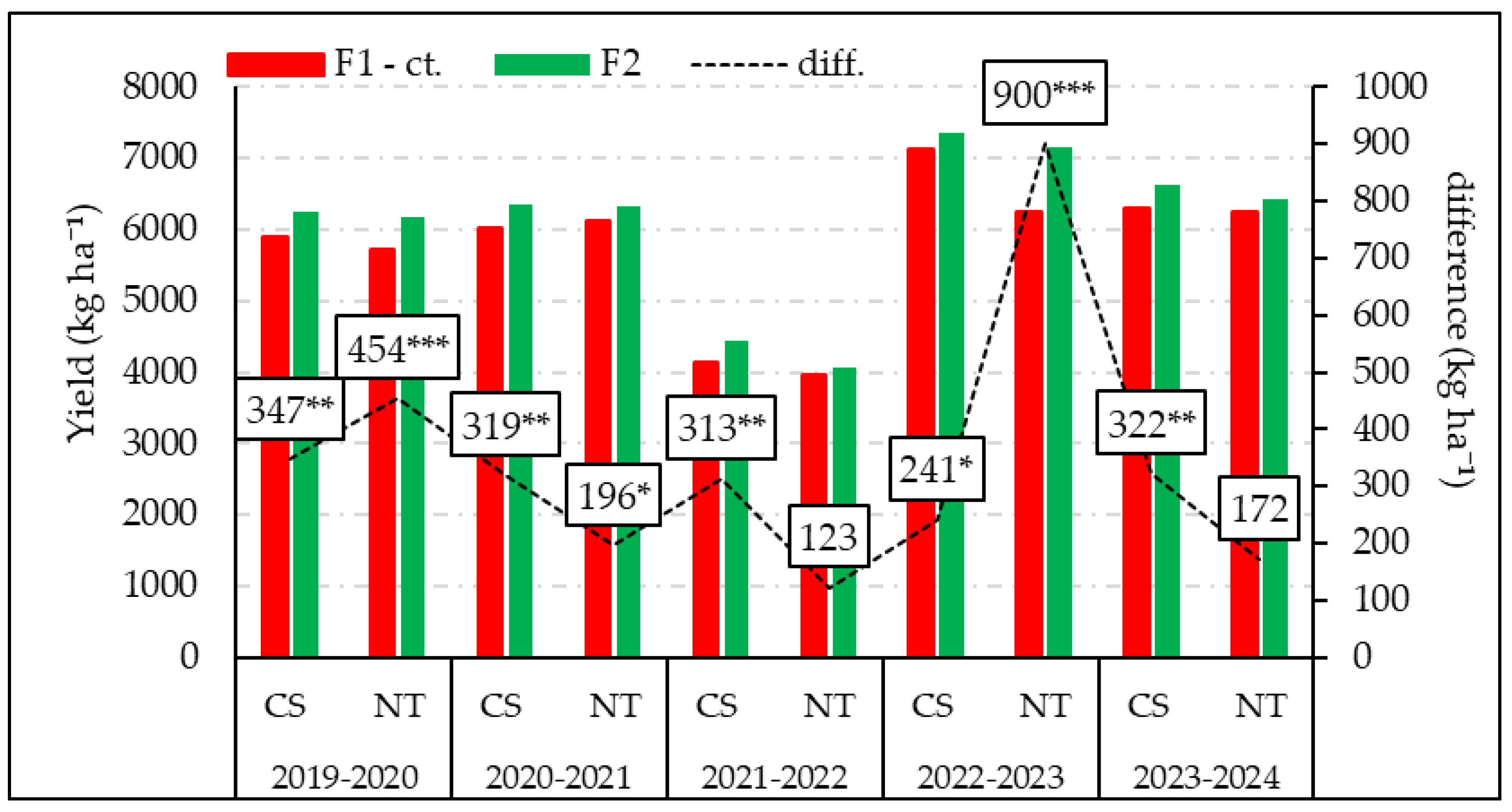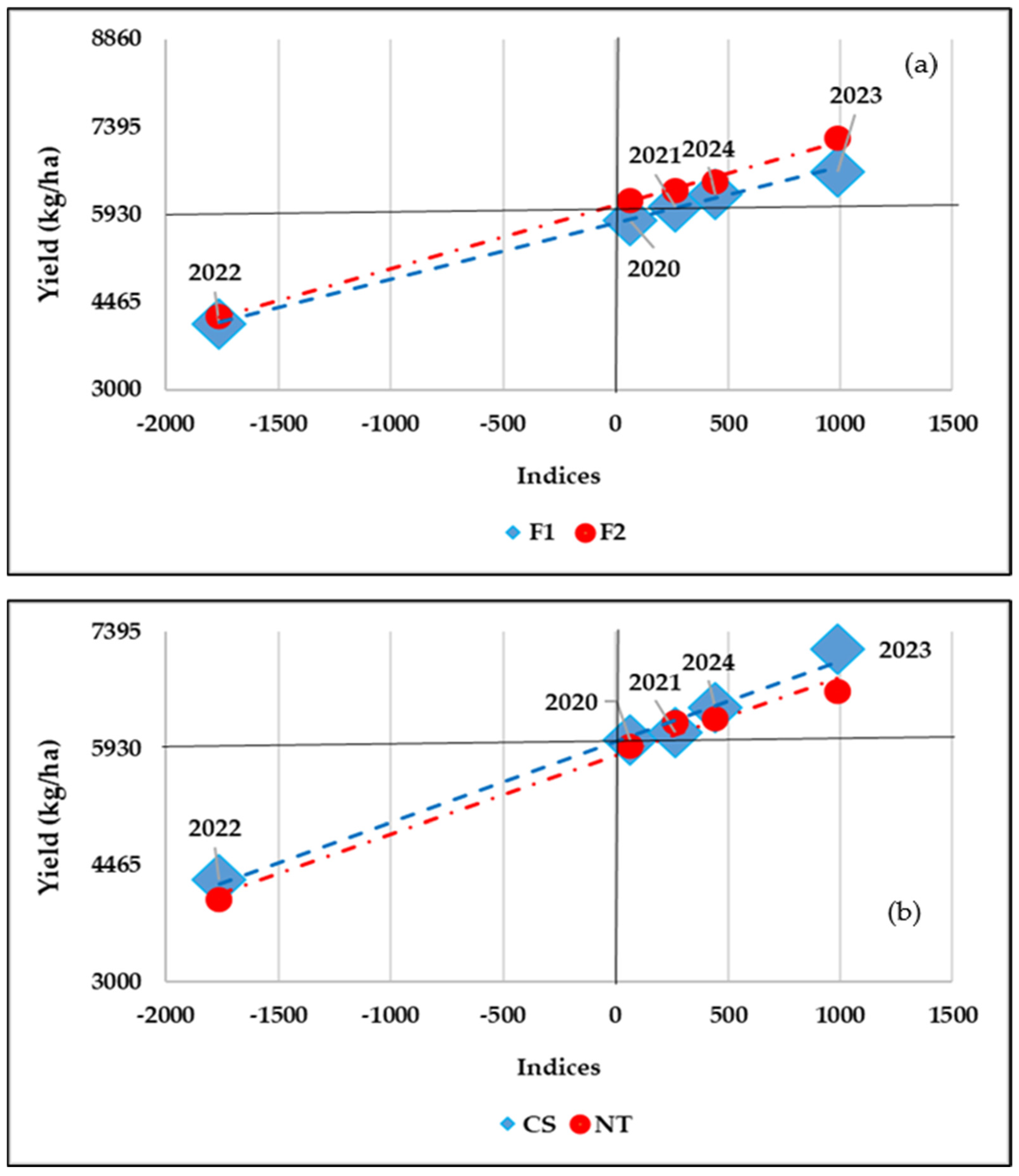 - Yij represents the mean yield of fertilization/tillage system variant i in environment j (where i = F1, F2/CS, NT and j = 2021, 2022, 2023, 2024, 2025, 2026).