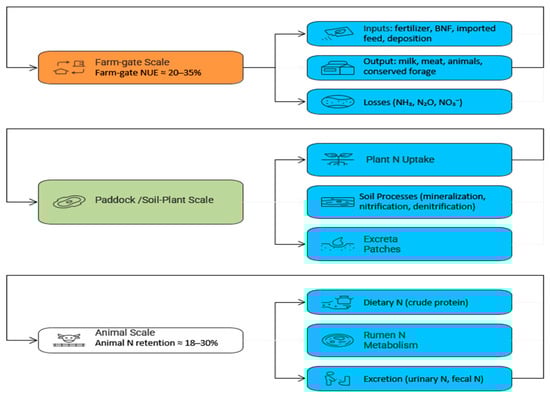 Pasture-based grazing systems exhibit nitrogen (N) flows that span interconnected biological, ecological, and behavioral processes. Nitrogen inputs derived from biological fixation, synthetic fertilizer, imported feeds, and atmospheric deposition enter a dynamic continuum of plant uptake, soil microbial transformations, and animal ingestion and excretion. Losses through volatilization, leaching, and N2O emissions emerge from these processes and are strongly modulated by diet composition, grazing behavior, and the spatial distribution of excreta. Synthesizing N dynamics across soil, plant, animal, and behavioral scales is therefore essential to evaluate and improve nitrogen use efficiency (NUE) and environmental performance in grazing systems. These multi-scale nitrogen flows are illustrated in Figure 1, which summarizes farm inputs, internal cycling, product exports, and loss pathways in a pasture-based grazing system.