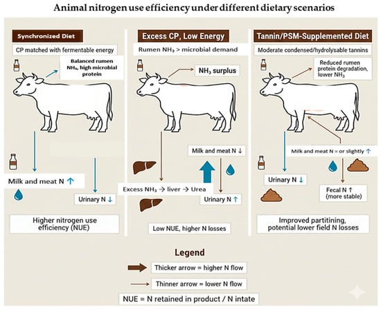 Conceptual comparison of nitrogen partitioning in cows fed (left) a synchronized diet where crude protein (CP) supply is matched with fermentable energy, (middle) a high-CP, low-energy diet where rumen NH3 production exceeds microbial demand, and (right) a tannin/plant secondary metabolite (PSM)-supplemented diet. In the synchronized diet, balanced rumen NH3 and high microbial protein increase N retained in milk and meat and reduce urinary N, yielding higher nitrogen use efficiency (NUE). Under excess CP and low energy, NH3 surplus is converted to urea in the liver, increasing urinary N losses and lowering NUE. In tannin/PSM-supplemented diets, moderate condensed/hydrolysable tannins reduce rumen protein degradation and NH3 concentration, shifting N excretion toward more stable fecal N while maintaining milk and meat N at similar or slightly higher levels, thereby improving partitioning and potentially lowering field N losses.
