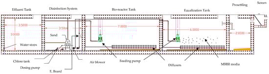In this study, the SBR is modified by integrating the MBBR’s robust biomass retention (Figure 1) and the SBR’s operational flexibility (Figure 2 and Figure 3). This SBR is modified (MSBR) by incorporating an upstream equalisation tank with the high-density polyethene (HDPE) carriers to enhance the stability and buffering with the addition of diffusers to provide the needed dissolved oxygen and keep the media floating at the same time, unlike the previous modifications, which were made in the same SBR basin as exhibited in Figure 4. Here, the simplicity of cyclic operation is preserved as the SBR basin is unchanged, while the floating media with the optimal amount of dissolved oxygen enhances the partial organic removal and flow equalisation before the influent enters the main SBR basin: all that without a big increase in energy consumption. However, this novel design is not just to propose a new configuration but also to assess its performance compared to conventional SBRs and MBBRs based on effluent quality.