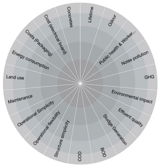 The environmental dimension comprised six indicators, including overall environmental impact, greenhouse gas emissions, effluent quality (with particular emphasis on total nitrogen (TN) and ammonium–nitrogen (NH4+–N)), organic matter removal efficiency (BOD and COD), and sludge management. The economic dimension included nine indicators: costs related to packaging and electrical boards, structural simplicity, operational flexibility, operational simplicity, maintenance requirements, land use, energy consumption, and civil works. In addition, four social acceptability indicators were considered, namely odour, public health and worker safety, noise pollution, and system lifetime.