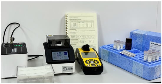 Influent and effluent samples were collected monthly from the SBR, MBBR, and MSBR units in Erbil, Iraq, from July 2024 to June 2025. Samples were analysed within 24 h of collection with storage at 4 °C to minimise physicochemical changes. Key parameters, including TN, NH4+–N, TP, COD, and turbidity, were measured with a Lianhua multiparameter analyser (model LH-MUP230 V11S) (Figure 7), and BOD5 was determined with an OxiTop® respirometric system. TSS and SO4 were tested using standard methods [22]. In situ measurements were made for EC, pH, and DO. Quality control involved routine calibration, blank checks, and duplicate analyses to ensure reliability.