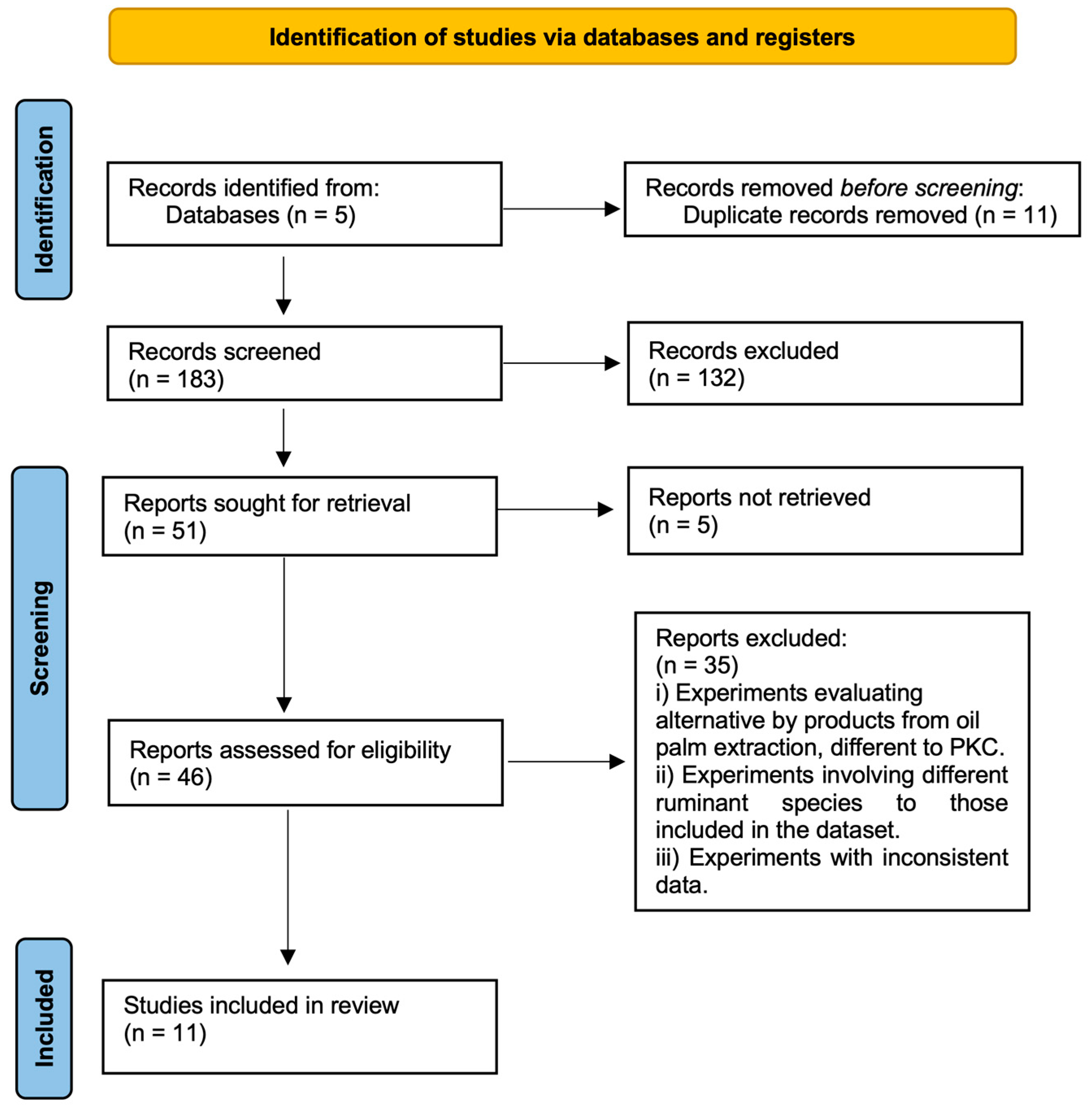 - Vargas, J.A.C.; Souza, A.P. Effects of Palm Kernel Cake on Nutrient Utilization and Performance in Confined Cattle, Sheep and Goats: A Comparative Meta-Analytical Approach. Animals 2025, 15, 2764. [Google Scholar] [CrossRef] [PubMed]
