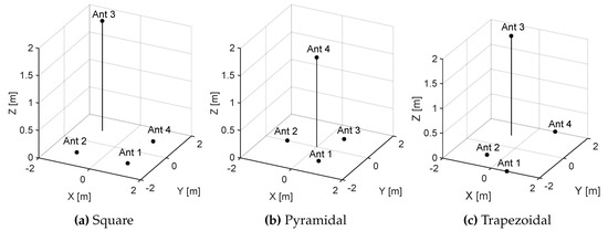 The effect on the error in the PD source location regarding the direction between the antenna arrays and the PD source is studied in this Section. Three points are analyzed: m, m and m, see grey points in Figure 4. All of the points are at the same distance from the center of each antenna array but with different directions. The results shows that the square configuration has a median in localization error for all 24 possibilities of 0.054, 0.047 and 0.074 m respectively for the three analysed PD positions. The pyramidal layout has a median of 0.070, 0.322 and 0.064 m respectively and, finally, the trapezoidal arrangement has error medians of 0.034, 0.047 and 0.049 m respectively. As these results show, the direction of the PD source and the antenna arrangements affect the localization errors. In the analysed directions, the trapezoidal layout reports lower and more stable location errors than the other configurations. The full statistic results are shown in the box plots displayed in Figure 5.