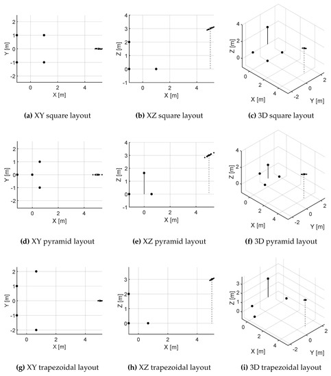 It can be seen that the trapezoidal configuration yields a more compact scatter point localization set than the square and pyramidal configurations confirming that, in the directions considered, the trapezoidal configuration appears to produce lower errors than the other configurations.