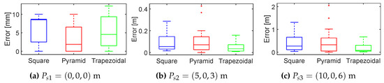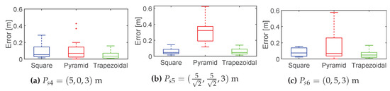 In the square configuration, at m, the median of all 24 possible errors is 0.054 m and at m is 0.27 m, five times larger though the distance is only doubled. The same happens in the pyramidal configuration: at m the median is 0.070 m and at m is 0.32 m. Finally, in the trapezoidal configuration, at m the median is 0.034 m and at m the median is 0.08 m, which is 2.35 times larger. Therefore, it can be concluded that, in this direction, the trapezoidal configuration is better for two reasons: namely it has the lowest location errors in both cases and the error for longer distances has a lower rate of growth.