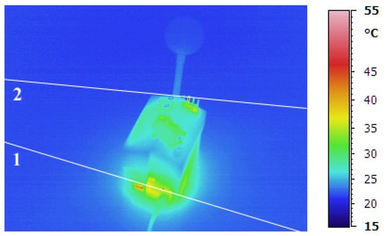 At the beginning of the test (Figure 1b) it is possible to notice an almost constant distribution of temperature along the case, slightly lower than 25 °C. Two localized increases in temperature can be observed at the resistor of the anemometer as well as in the lower part near the power jack, where the voltage regulator of the Arduino UNO is located.