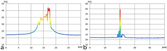 Profile 1 highlights the disturbance in temperature distribution due to the voltage regulator (Figure 4a). It can be observed how a disturbance of the temperature range due to the voltage regulator and to the nearby power jack extends to a diameter of about 10 cm. Profile 2 shows the field of perturbation due to the anemometer (Figure 4b). In this case the perturbation of the temperature due to the anemometer extends to a diameter of about 6 cm.