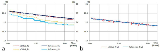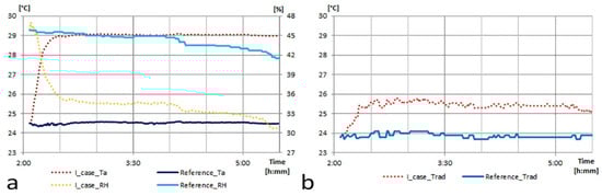 Figure 5a describes the trend of the air temperature (Ta) and relative humidity (RH) recorded by the integrated sensor mounted on the monitoring system. Figure 5b describes the trend of radiant temperature (Trad). The values recorded by the device are compared to that measured by two reference sensors: a thermoigrometric sensor (Reference_Ta and Reference_RH in Figure 5a) and a globe thermometer (Reference_Trad in Figure 5b).