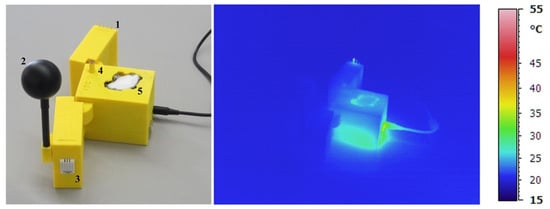 After approximately 24 h of use of the first prototype of nEMoS (Figure 3), a maximum temperature slightly above 50 °C was noticed on the top of the case in correspondence of the anemometer as well as a temperature of about 40 °C in the lower part near the power jack, where the voltage regulator is located.