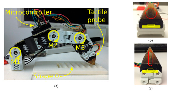 Experimental setup: (a) Robot finger composed of 3 motors: M1 is the “bottom” motor; M2 is the “middle” motor; and M3 is the “top” motor. The microcontroller is attached on top of Motors M1 and M2. (b) Front view of the tactile probe: the MARG system is embedded under the red circle; the pressure sensor is under the yellow overlay in the black 3D printed collar. (c) Side view of the tactile probe.