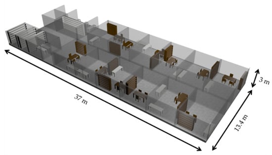 Simulations have been carried out in different areas of the Emergency-department of the Hospital of Navarre, in the city of Pamplona. As an illustrative example, in Figure 1 the Boxes room zone scenario created for the 3D Ray Launching simulations is shown. The scenario has a size of 37 m × 13.4 m × 3 m and it is representing an area of the ground floor of the Emergency building of the HCN. The scenario consists of 12 rooms, called Boxes, where different medical staff cares for patients. This rooms are very similar and they have tables, chairs and shelves, in addition to the required medical stuff and devices. The constitutive materials of all the elements within the scenarios have been taken into account, introducing their dielectric properties in the simulator with the aim of obtaining accurate radio propagation estimations at the frequency of operation.