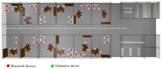 For the simulations, the blood pressure monitor, the thermometer, the pulsioximeter and the glucose meter have been placed within each room, since they are common medical devices usually present in the real environment under analysis. The placement of the devices is depicted in Figure 3, where some devices are on the tables and others on the medical stretcher. An extra device (represented as a green point) has been placed within the aisle, which corresponds to a device used to validate the simulation results within this kind of environments. The main radio characteristics of the used Bluetooth devices both for simulations and validation measurements are summarized in Table 1.