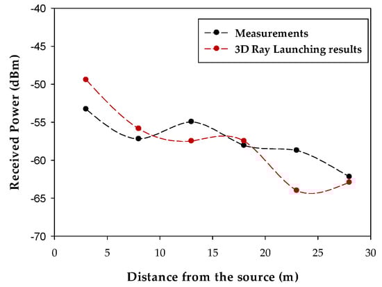 Firstly, in order to validate the simulation results obtained by the 3D Ray Launching algorithm employed in this study, a specific simulation has been carried out to compare their results with measurements within the scenario under analysis. This simulation corresponds to the transmitter represented as a green dot in Figure 3. The white dashed line of the picture shows the linear path where measurements have been taken. Figure 4 shows the comparison between measurements and estimated results by means of the 3D Ray Launching method. The graph shows the typical variations of received RF power level due to multipath propagation, which is the most significant radio propagation phenomenon within complex indoor scenarios. The obtained results show good agreement between simulations and measurements.