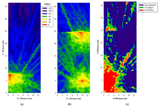Then, the rest of simulations have been performed. As an example, the bi-dimensional plane at height 1.5m of the device #6 is depicted in Figure 5a, where the RF power distribution throughout the whole scenario can be seen. As one of the aims of this work is to study the performance of Bluetooth-based WSNs within this kind of environments, an important issue is the coexistence of several Bluetooth piconets and devices operating within the scenario. For that purpose, other three deployed devices (#31 and #48) have been chosen to consider them as interference to the communicating device #6. Note that this will happen only when a collision with the signal sent by the selected 2 devices happens. Figure 5b shows the RF power distribution for the 2 interfering devices for the height of 1.5m. In order to show the effect of such potential interference, Figure 5c shows if the obtained SNR requirements are fulfilled for the situations of an asynchronous 8DQPSK communication at 2178 Kbps (red area), which corresponds to a high Bluetooth data rate, and for an asynchronous GFSK communication at 57.6 Kbps (extended green area). The required SNR values have been calculated by means of the well-known Shannon formula and they are 5.47 dB and -13.9 dB respectively. The dark blue colored area does not meet the requirements for a successful Bluetooth communication at those data rates.