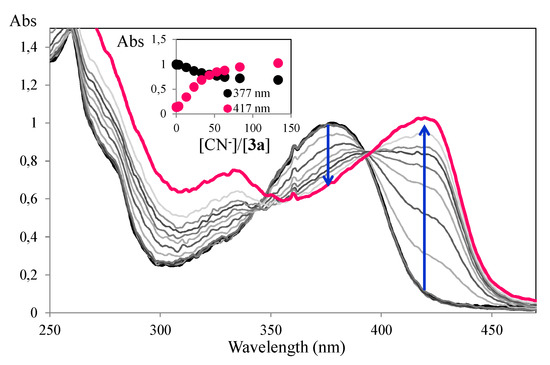 Considering these preliminary results, spectrophotometric titration of compound 3a in ACN with these selected ions were undertaken. Titration with CN− revealed a trend in the UV-Vis spectra, the intensity of the longest wavelength absorption band at 373 nm decreased progressively upon addition of the anion, with the simultaneous growth of a new red-shifted absorption band located at 424 nm (Figure 2). It can be seen that a very small amount of cyanide ion (0.3 equiv) caused large changes in the absorption spectrum and a drastic color change in the solution of compound 3a.