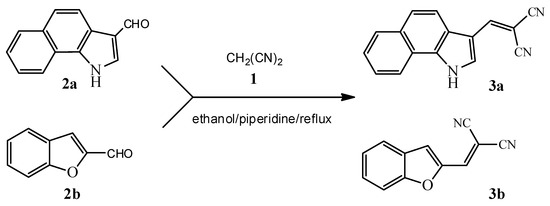 Dicyanovinyl 3a–b were synthesized in moderate to good yields (65%–74%), by a Knoevenagel reaction between malononitrile 1 and aldehydes 2a–b. The new compounds were completely characterized by the usual spectroscopic techniques (Scheme 1, Table 1).