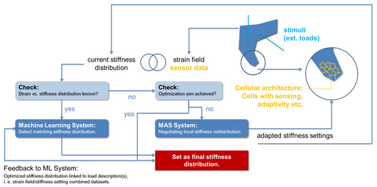 Figure 1 illustrates the main functionalities of the control concept and their interaction, which like in MPTO follows an iterative approach meant to converge towards the optimization target. Starting point is the current stiffness distribution. Subjecting the component in question to external loads will result in state changes in the individual cells, e.g., described by a strain field. If the part has encountered this same load before, and if this fact is recognized internally by matching the current strain distribution with the response represented by the strain field, an associated stiffness distribution can be selected directly. Doing so is the task of a machine learning system which maintains links between stiffness and e.g., strain distributions on the one and load cases on the other side: Any new load case encountered will be classified accordingly via an incremental learning strategy to make it available in future for direct stiffness distribution setting. For unknown load cases and the case that the present stiffness distribution does not reflect the optimization target, a Multi-Agent System (MAS) is envisaged which will negotiate the re-setting of properties between the material’s cells, making use of changes in sensor data as feedback to either confirm or discard the changes effected in each iteration.