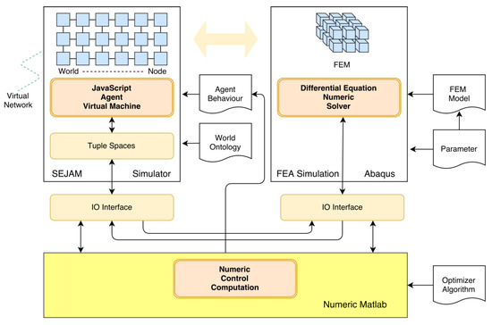 Figure 2 illustrates the interaction of the software components in more detail. The MAS system itself will be based on previous studies addressing material-integrated intelligent systems aimed at structural monitoring rather than control [12,13,14]. Testing and competitive evaluation of candidate algorithms for this task will be a major aspect of further research in this field. Of similar importance is the question in how far distributed, localized decision-making can approximate a global optimum, and thus whether communication and algorithms on global scale might be needed in addition to the local ones. Prior to settingup a physical structure, such issues will be evaluated using the virtual test environment described in the following section.