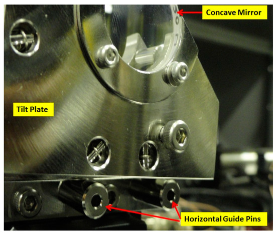 They pass through middle plate and are connected to the tilt plate. Angle adjustent piezo provides angular displacement to tilt plate in vertical and horizontal direction. A long cyilindrical piezo actuator is used for cavity length expansion, while two short cyilindrical piezo actuator are used for angular displacement as shown in Figure 3. There are two vertical guiding pins and two base guiding pins on base plate as shown in Figure 4 and Figure 5. The middle plate is tightly fixed between four guiding pins. Both concave mirrors of optical cavity are designed for 1064 nm wavlength. The radius of curvature of both concave mirrors is 420.3 mm. Distance between concave-concave mirror is kept at 840 mm. All mirrors used in cavity design are of 1 inch diameter.