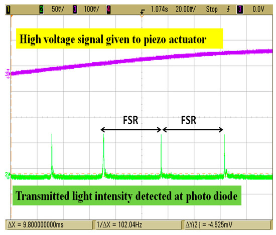 In Figure 6, the blue waveform shows the voltage of piezo actuator, which means cavity length expansion. The green waveform shows the signal from photo diode detecting the cavity transmitted laser power.