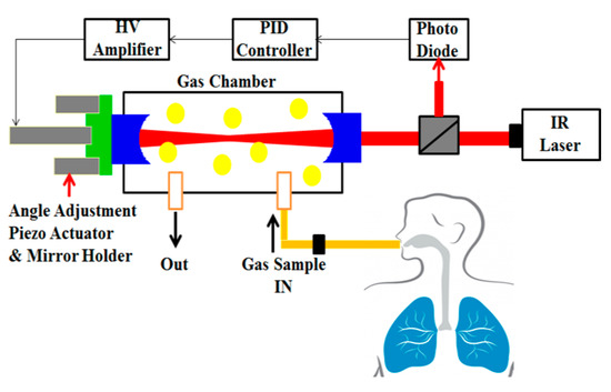Breathing is a complex process of gas exchange by diffusion of gasses over the lung capillaries. Exhaled breath contains thousands of molecules, which are at the level of parts per billion (ppb) or even parts per trillion (ppt) [1,2]. These molecules can provide important information about functioning of respiratory system. When IR laser interacts with these molecules, each molecule exhibits a strong absorption peak. A patient’s breath sample is collected inside a gas cell and wavelength of laser is tuned with respect to absorption peak for particular gas. According to Lambert-Beer’s law [2], The transmitted light intensity depends of path of laser within gas sample and absorption strength of gas molecules. An optical resonator system can be used for detection of particular gases within breath sample. The laser resonator works on the multiple reflections across two boundaries of the mirrors. The optical system consists of high finesse Fabry-Perot resonator inside a gas chamber. When gas molecules interact with IR laser, the photo diode records the change in intensity of laser which corresponds to absorption from particular gas molecules as shown in Figure 1. By detecting the absorption of gases, we can detect and monitor a disease with gas molecules [3]. The following Table 1. shows list of disease associated with particular gas molecules.