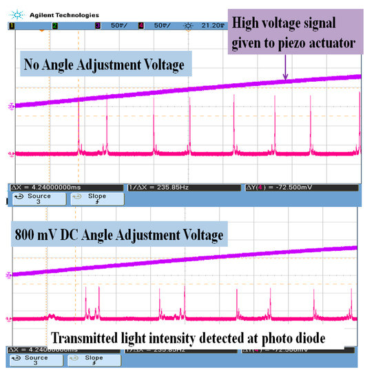 To overcome misalignment during resonance process, we used angle adjustment piezo actuators as shown in Figure 8. By giving DC voltage to angle adjustment piezo we can check their performance. Figure 9 shows two different cases of piezo operation. In first case no voltage is given to angle adjustment piezo actuator. There is no change in transmitted light intensity is observed. In second case, we provide 800 mV DC voltage to horizontal angular adjustment piezo and 50% loss of transmitted intensity is observed at photo diode. By further increasing applied voltage to 800 mV DC, transmitted light intensity is recovered. Thus by this operation, we conclude that angle adjustment piezo can be used to compensate for any angular misalignment given to resonator and experiment can be performed without any loss of laser beam intensity inside gas chamber. As gas chamber is closed during experiment so it is very difficult to fine tune mirrors externally for any misalignment. With special mirror holder, we can control motion of mirror externally and operate cavity at resonance.