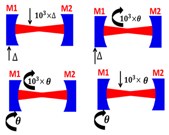 Figure 10 shows study of laser beam misalignment inside cavity, when any one mirror of cavity is subjected to position or angular shift. Two concave mirror M1 & M2 of resonators are highly sensitive to misalignment [8]. If one of the concave mirrors is subjected to both position and angular misalignment, then it is very important to know the total angular and position misalignment for the laser beam. The Δ indicates position misalignment while θ indicates angular misalignment. For any misalignment to mirrors of resonator, there will be drastic change in position of laser beam. In this experiment, each concave mirror is subjected to position misalignment of 1 μm and angular misalignment of 1 μ-rad. The change in position and angle of laser beam is observed. The following table shows experimental result of observed laser misalignment inside resonator. M1 stands for first concave mirror and M2 stands for second concave mirror. The following Table 2 shows the effect of misalignment of mirror towards laser beam position inside cavity.