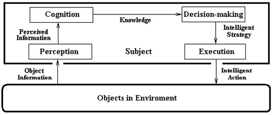 In the model of Figure 1, the part at the bottom stands for the object in environment that presents the object information while the part on the top stands for the subject interacting with the object through the following processes: the object information is conversed to perceived one (perception), and the latter is conversed to knowledge (cognition), and further conversed to intelligent strategy (decision-making), and finally conversed to intelligent action (execution) that is applied on the object, forming the basic process of information ecosystem.