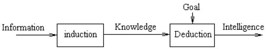 On the other hand, there is an external chain of knowledge ecology that is from (perceived) information to knowledge via inductive operations and then from (perceived information and) knowledge to intelligence via deductive operations under the guidance of the system’s goal as is shown in Figure 4.