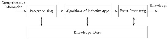 As is seen from Figure 6, the input of the scheme is the comprehensive information whereas the output of the scheme is the knowledge newly produced. The knowledge base, as a fundamental element of the scheme at the bottom in Figure 6, will provide support to the unit of inductive-type algorithms by giving ‘the scope of the knowledge interested’ and ‘the knowledge already had’ so that the unit of inductive-type algorithm can work properly. At the same time, the knowledge base will give supports also to the units of pre-processing and post-processing.