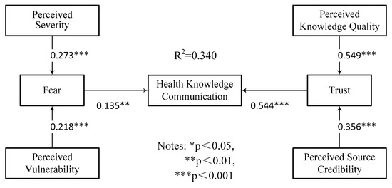 After establishing the validity of the measures, we test the structural paths in the research model. Test details are shown in Figure 2. As expected, in the first communication form of health knowledge—fear communication, there are a significant positive relationship between fear and health knowledge communication (β = 0.135, p < 0.01), and positive relationships between fear and perceived severity (β = 0.273, p < 0.001) and perceived vulnerability (β = 0.218, p < 0.001). As such, H1, H2 and H3 are supported. In the second communication form of health knowledge—trust communication, there are a significant positive relationship between trust and health knowledge communication (β = 0.544, p < 0.001), and positive relationships between trust and perceived knowledge quality (β = 0.549, p < 0.001) and perceived source credibility (β = 0.356, p < 0.001). As such, H4, H5 and H6 are supported.