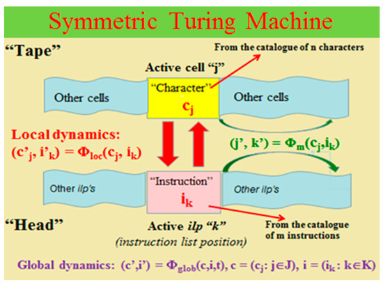 The only difference between a-machine and s-machine is that its functioning in the general case is an interaction at the local level between a cell j (with some character cj, i.e., in the state cj) and instruction list position k (with instruction ik, i.e., in the state ik). In this interaction both the active cell and active instruction position can change state. What we call “character in the cell” or “instruction on the instruction list position” is simply information associated with the state and does not require any specific format. Actual changes in the machine are results of the dynamics which does not have to be localized in any particular place. The machine becomes authentically symmetric.