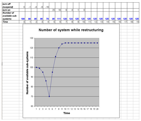 Changes in the number of available sub-systems during an adaptation process.) After a successful restructuring (Time = 5) the sub-systems’ activity is re-enabled. This (re-)activation is spreading like an epidemic but in a reverse order. The parent system now includes the newly connected sub- system (in our case additional 25).