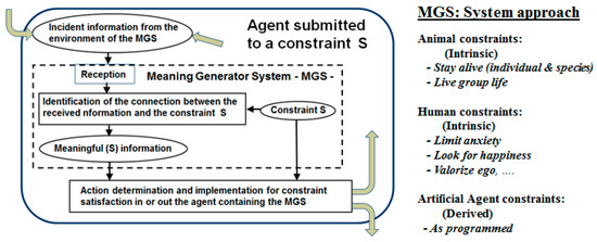 The Meaning Generator System is represented in Figure 1. It is part of an agent submitted to an internal constraint. The generated meaning is information leading the agent to implement an action satisfying the constraint in a dynamic mode. The action can be internal or external to the agent, and it can be physical, biological or mental.