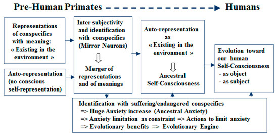 As said, application to humans is more complex as the understanding of human constraints is limited by our lack of visibility on the nature of human mind. To reach some understanding of human constraints we use an evolutionary scenario for self-consciousness that introduces anxiety limitation as a generic human constraint [4]. The scenario is based on the evolution of meaningful representations. It describes what could have been an evolution toward an elementary form of self-consciousness (an ‘ancestral self-consciousness’) resulting from pre-human primates becoming able to represent their own entities as existing in the environment like conspecifics were represented. Such performance is assumed as having been possible by an evolution of inter-subjectivity into identification with conspecifics at pre-human times. But the identification with conspecifics was also about identifying with suffering or endangered conspecifics that has produced a huge anxiety increase within our ancestors, an ‘ancestral anxiety’, having the same evolutionary origin that our ancestral self-consciousness. Anxiety limitation processes implemented to limit that anxiety increase have procured key evolutionary advantages and structured an ‘evolutionary engine’ favoring the evolution toward humans. That evolutionary scenario links the nature of human consciousness to anxiety management.