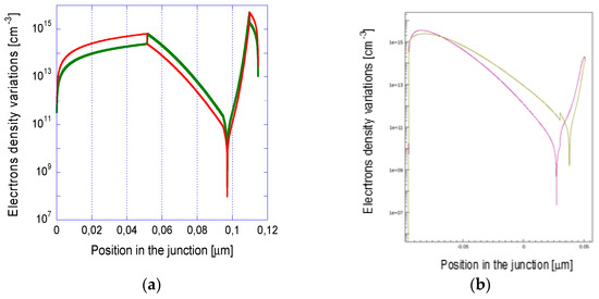 The AC model depicts the mechanisms of the THz modulation of the charge in the depleted regions of the structure. Comparison with TCAD simulations permits to validate the model assumptions. In Figure 3a, the distributions of real (red lines) and imaginary (green lines) parts of variations of electron density are reported, as obtained from the combination of the two asymptotic solutions and , and are compared in Figure 3b with the same quantities obtained with the TCAD simulator, at the frequency of 1 THz. Both the approaches indicate that the ratios between the real and the imaginary parts exchange within the depletion layer, corresponding in the model at the exchange between the two asymptotic solutions. The discontinuity in the model is justified by asymptotic approach of the solution. In this simulation the n is doped 5 × 1016 cm−3.