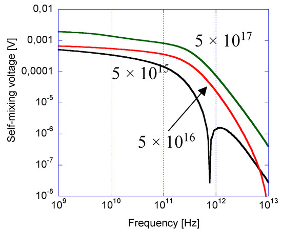 The frequency behavior of the DC self-mixing voltage generated through the structure, with different values of doping of the n layer in cm−3.