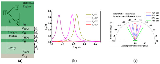 (a) 1D configuration of the 5 layer VERTE stack (without grating) (b) Corresponding emissivities at different wavelengths and (c) emission angles. Upon varying the resonant wavelength, the emissivity keeps its maximum, but its emission angle increases with narrowing angular bandwidth.