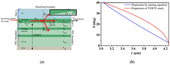 (a) Sketch of the simulated 2D-FEM domain (VERTE-Waveguide); (b) Angles of selected grating diffraction mode (blue) and peak emittance of the VERTE main lobe (red) versus wavelength.