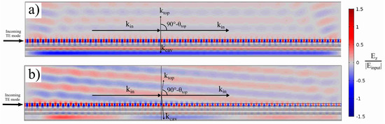 Total field distribution of the E-field z-component for an incoming vacuum-wavelength of (a) 4.26 µm leading to vertical coupling and (b) 4.18 µm leading to ~8° coupling. The grating period was kept constant at 1.48 µm (60 periods were considered).
