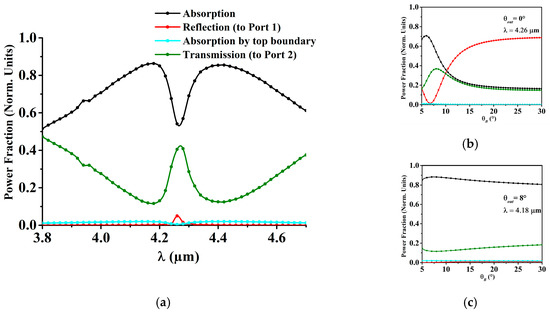 where R denotes the power reflected back to the input port, T is the transmission to the output port and A is the total power absorbed in the simulated domain. Assuming the absorption is negligible in Si and SiO2 (which is a good approximation in the mid IR region), the total absorption A can be written as A = AMetal + ATop with AMetal being the absorbed intensity in the silver layer and ATop being the intensity of the free space radiation absorbed by the top boundary of the simulation model. As can be seen in Figure 2a, the top boundary is the only one with absorbing properties. Perfect electric conducting boundaries at the remaining side walls ensure that there are no further absorbing losses in the simulated domain. By Kirchhoff’s law (see e.g., [3]), the fraction absorbed by the metal AMetal(θ,λ) at a specific wavelength λ and angle θ is equal to the emittance (θ,λ) of the stack configuration with respect to radiation into the WG at thermal equilibrium. Thus, in terms of reciprocity AMetal(θ,λ) = (θ,λ) corresponds to the energy fraction coupled into the waveguide from a cavity mode created by thermal radiation when it is used as an emitter.