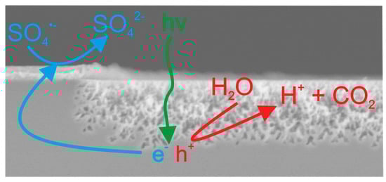 During etching porous layers were generated at the bare SiC surface which had not been covered with Pt. This is illustrated in Figure 1. One can see a secondary electron microscope (SEM) micrograph showing pSiC and the schematically indicated charge carrier flow paths during etching. UV light generates charge carries (electrons e−, holes h+). The holes, together with H2O are responsible for the oxidation of SiC, while the oxide is afterwards dissolved by HF leaving behind pSiC. To restore charge neutrality during etching, the electrons are accepted from the oxidizing agent (SO4−) at the Pt/etching solution interface [3].