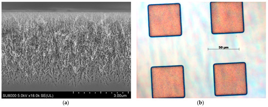 For successful application of the generated pSiC layers, the Pt cathodes have to be removed completely after MAPCE without damaging or dissolving the pSiC. This was possible with aqua regia, as is shown in Figure 2 (sample resistivity of 0.106 Ω·cm). One can see that the pSiC remains intact after removing the Pt with boiling aqua regia (see Figure 2a). A corresponding top down view (see Figure 2b) shows that it is possible to locally define pSiC on single crystalline substrates. The orange areas show pSiC which is surrounded by dense SiC.