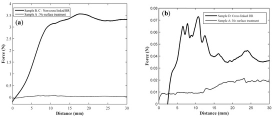 Comparison of forces measured to peel PDMS from the PI show in (a) between non- cross linked BR sample and no surface treatment sample, and in (b) between cross linked BR and no treatment PI surface. The negative forces in the graphs represent the stiffness of the PDMS which pushes against the load cell in the beginning before giving stable force values.